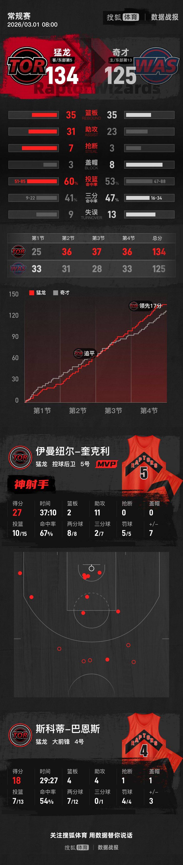 【搜狐体育战报】北京时间3月1日NBA常规赛,客场作战的猛龙以134-125击败奇才,奇才遭遇4连败。奎克利27分2篮板11助攻,莱利19分4篮板3助攻。
