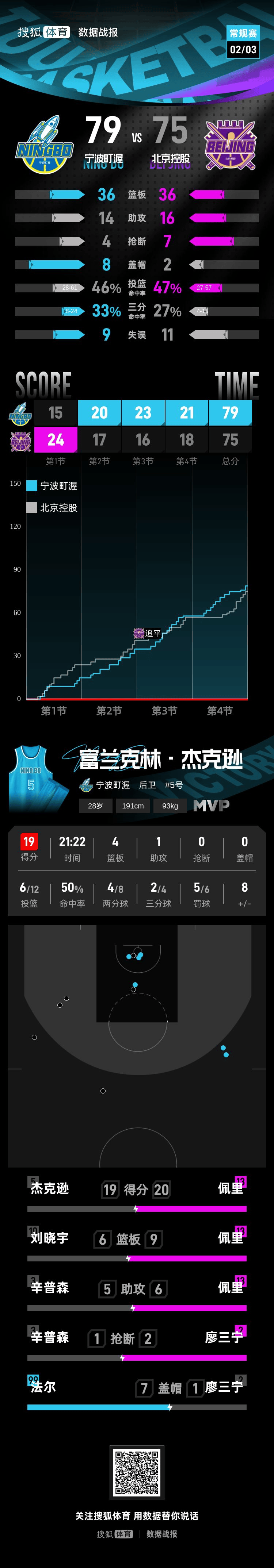 【搜狐体育战报】北京时间2月3日CBA常规赛第23轮,主场作战的宁波町渥以79-75击败北京控股,宁波町渥取得3连胜。富兰克林·杰克逊19分4篮板1助攻,雷吉纳德·佩里20分9篮板6助攻。